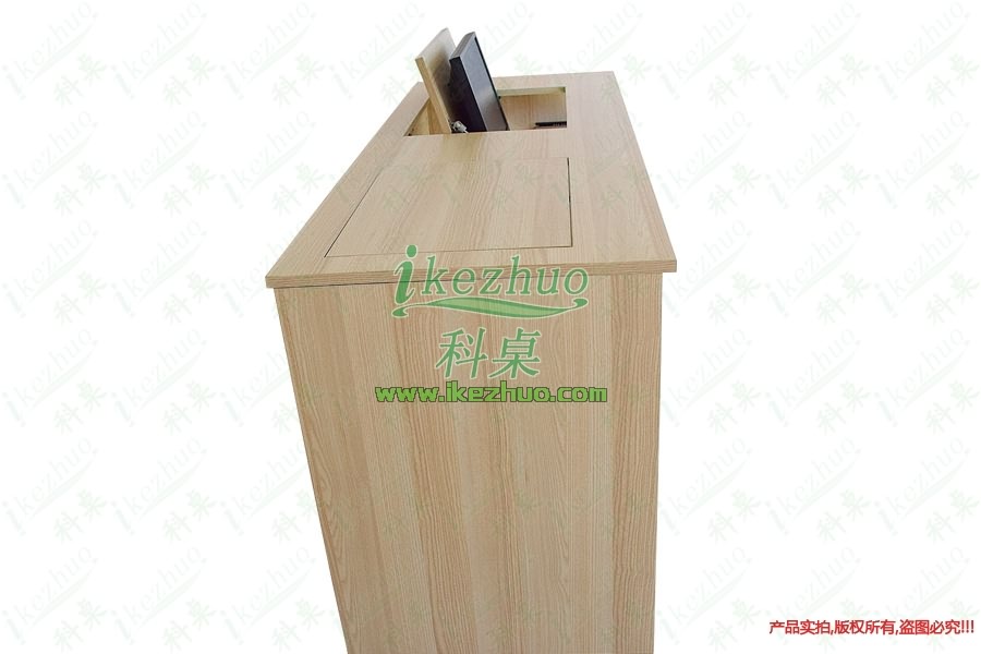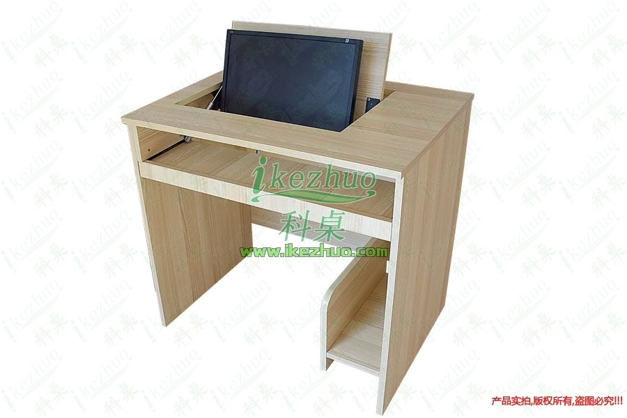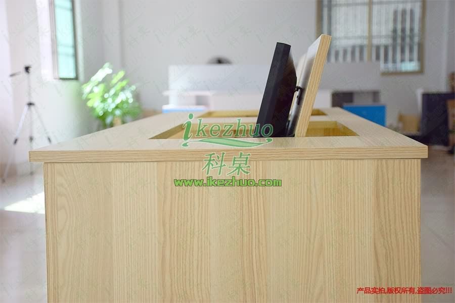 當(dāng)需要使用顯示器時輕按前端桌面板隱藏在桌子內(nèi)部的顯示器會自動從桌子下面升到桌面翻轉(zhuǎn)到合適角度。當(dāng)不使用顯示器時,可手動按下顯示器翻蓋面板至桌面平整,顯示器自動鎖住隱藏在桌子內(nèi)與桌面保持平整一致。起到防塵,防盜,保持桌面平整美觀。使用方便,手動控制,翻轉(zhuǎn)自如。